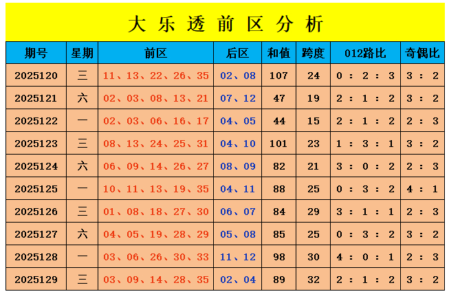 前区2路分析:前区2路号码上期开出2个号码14、35,前十期断区0次,前十期2路号码开出18个号码,走势较热,本期看好2路号码走势升温,本期看好出2个2路奖号,关怀号码:05、29
