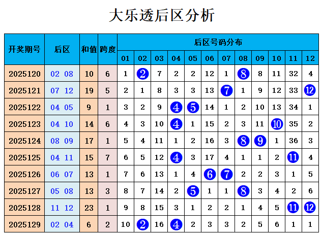 前区0路分析:前区0路号码上期开出2个号码03、09,前十期断区3次,前十期0路开出17个号码,走势较温;本期预测0路号码走势降温,本期看好出1个0路奖号,关怀号码:18