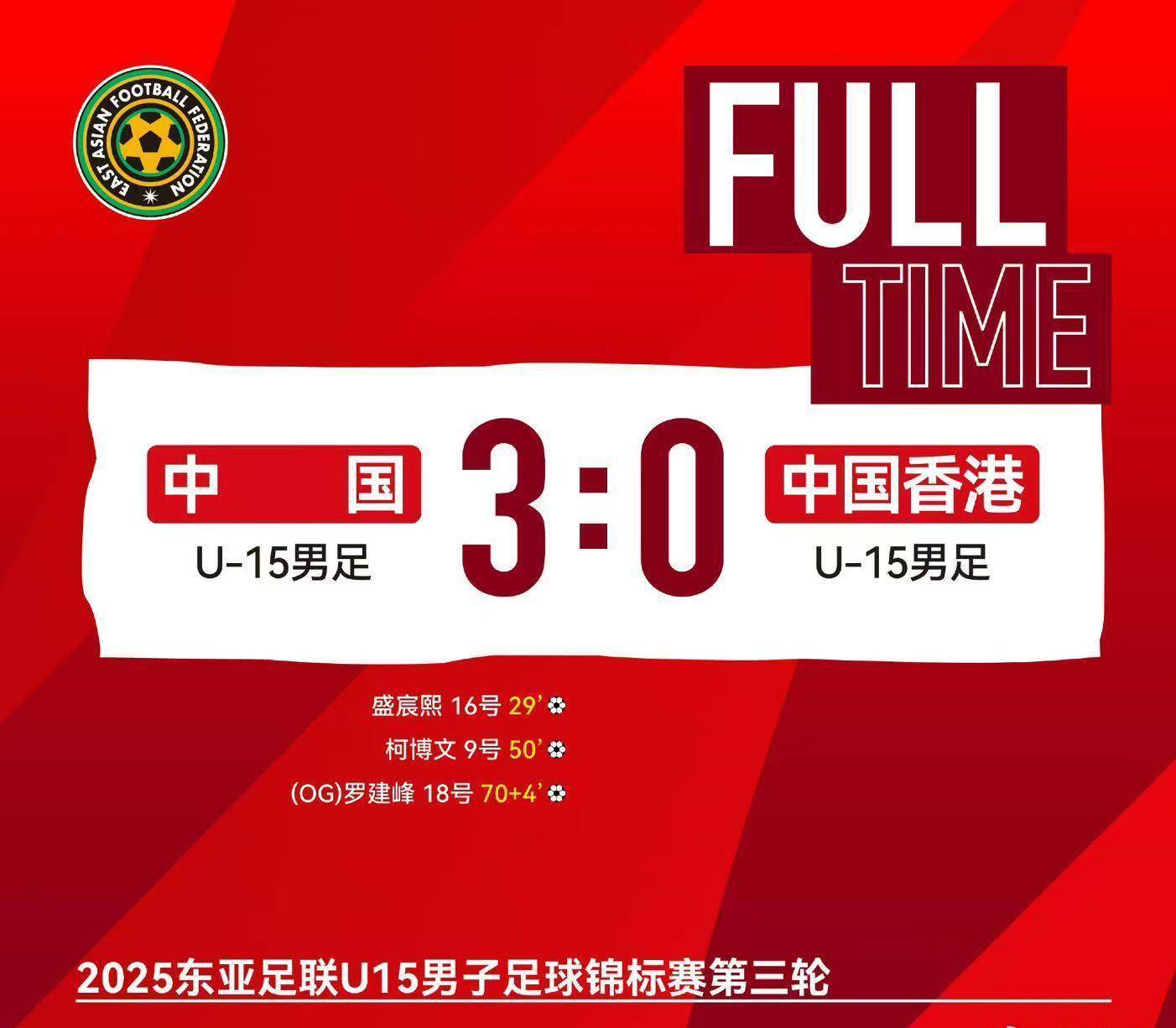 新华社福州12月22日电(记者刘旸)2025东亚足联U15锦标赛22日在福建漳州进行终末一轮比赛,A组的中国U15男足队3:0投降中国香港队,以一胜一平一负的战绩甘休本届赛事。 此前中国队负于日本队,战平韩国队,未始胜果。本场比赛第29分钟,李宇轩左路传中,盛宸熙高高跃着手球破门,为中国队先拔头筹。 下半时开场后不久,中国队诓骗角球契机打入一球,主裁判走漏越位在先,进球无效。第51分钟,前卫柯博文接盛宸熙斜传,濒临防卫球员左脚低射远角奏凯,中国队将逾越上风扩大至2:0。伤停补时阶段,中国队诓骗
