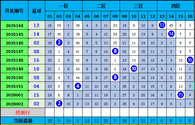 上期蓝球开出1区号码02,近10期4区比3:2:1:4,4区较热,本期大规模推选01、03、09、13、14,一码蓝球温雅01。