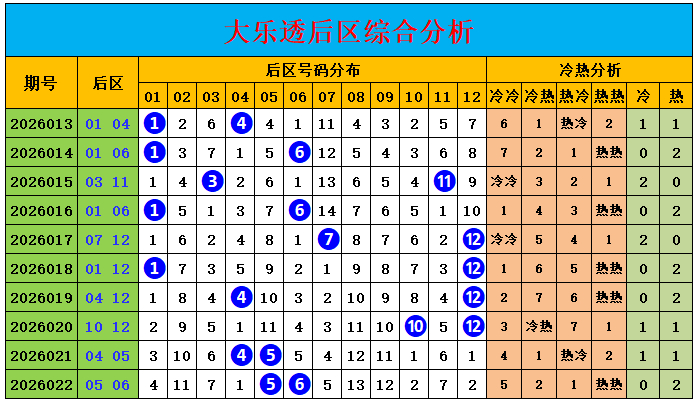上期后区开出号码05、06,为热热组合。最近10期后区冷热比7:13,热码合座走势稍热,最近10期后区冷冷组合开出2期,冷热组合开出1期,热冷组合开出2期,热热组合开出5期。